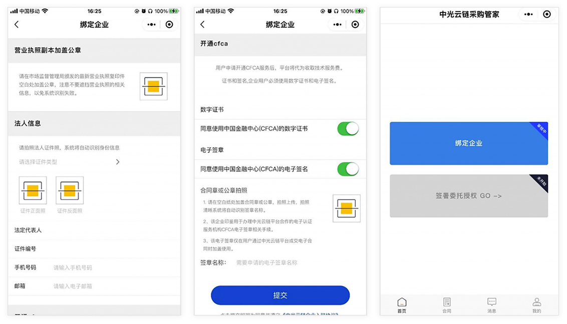 采購(gòu)管家小程序結(jié)合中國(guó)金融認(rèn)證中心(CFCA)電子認(rèn)證服務(wù),在保證安全的情況下,為用戶提供在線刷臉認(rèn)證蓋章服務(wù)。